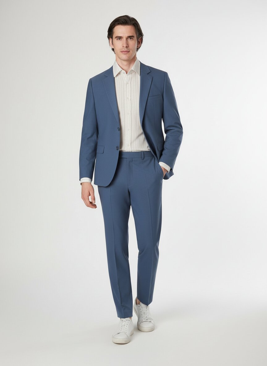 Der Anzug lässt sich sowohl klassisch mit einem cremefarbenen Hemd und dunklen Loafern für Business-Anlässe tragen als auch modern mit weißen Sneakern und minimalistischer Uhr für urbanen Casual-Chic. Das Sakko passt auch zu weißen T-Shirts für entspannte Freizeitlooks.