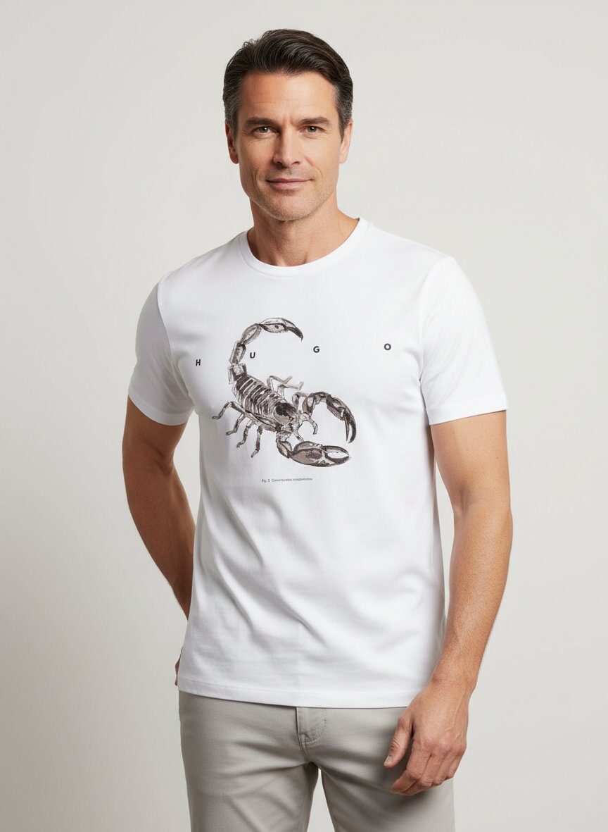 Das T-Shirt besticht durch einen plakativ gestalteten Skorpion-Print mit der HUGO-Schriftzug, der eine auffällige Statement-Grafik auf der Brust bietet.