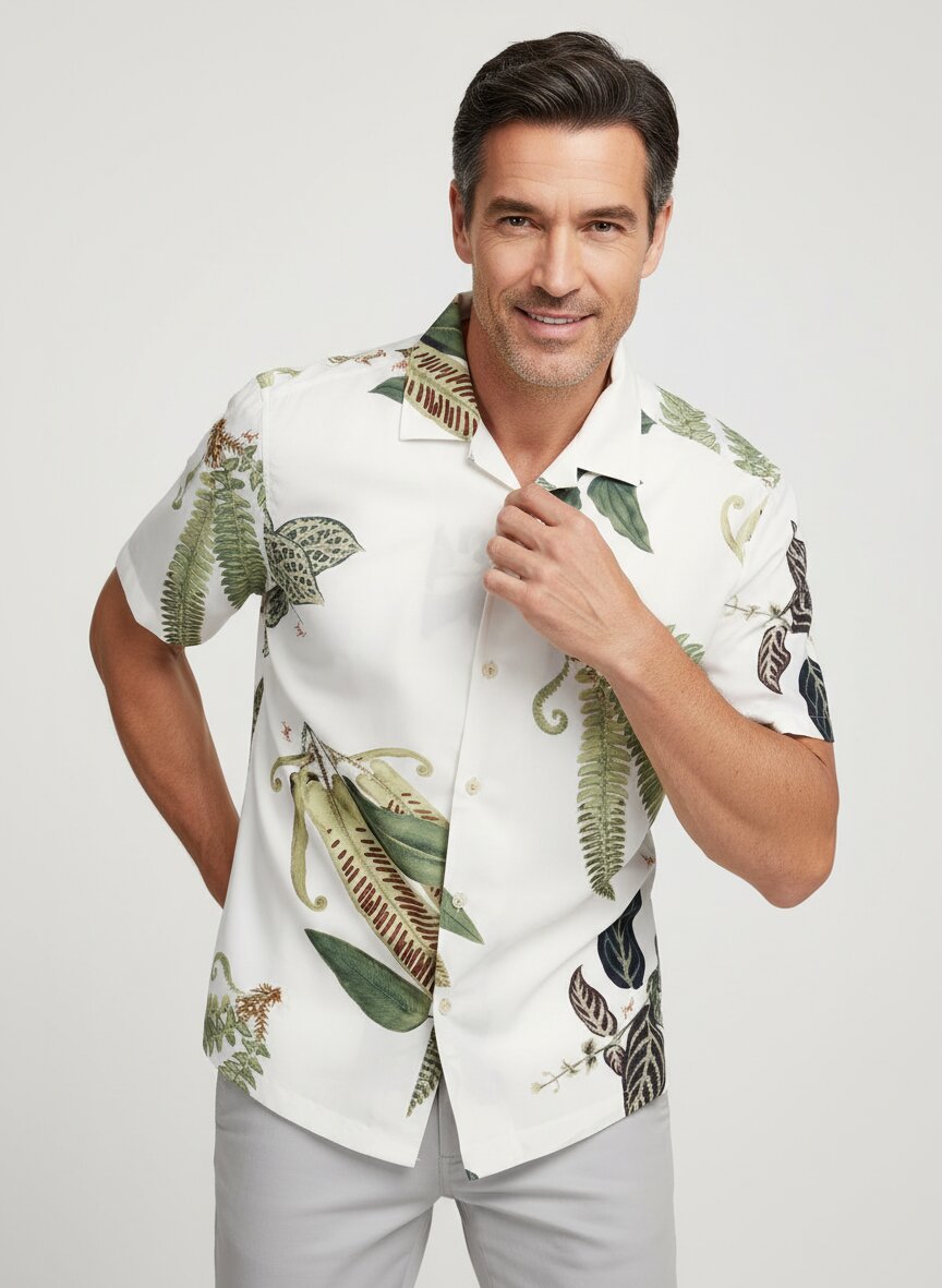 Das Hemd besticht durch ein elegantes ecru-grünes Floralmuster mit botanischen Motiven (Farne und Blätter), das sich vielseitig mit neutralen Hosen oder Shorts kombinieren lässt und einen Statement-Charakter hat.