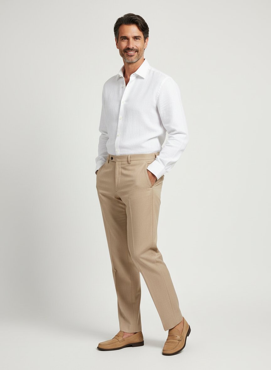 Beige Melange in feinster Woll-Stretch – Slim Fit mit Charakter