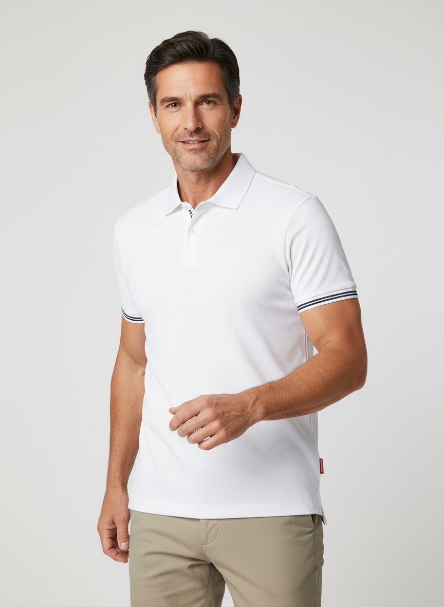 Kurzarm Polo-Shirt mit Zwei-Knopfblende, feine Kontraststreifen am Ärmelbündchen und am Untertritt der Knopfleiste