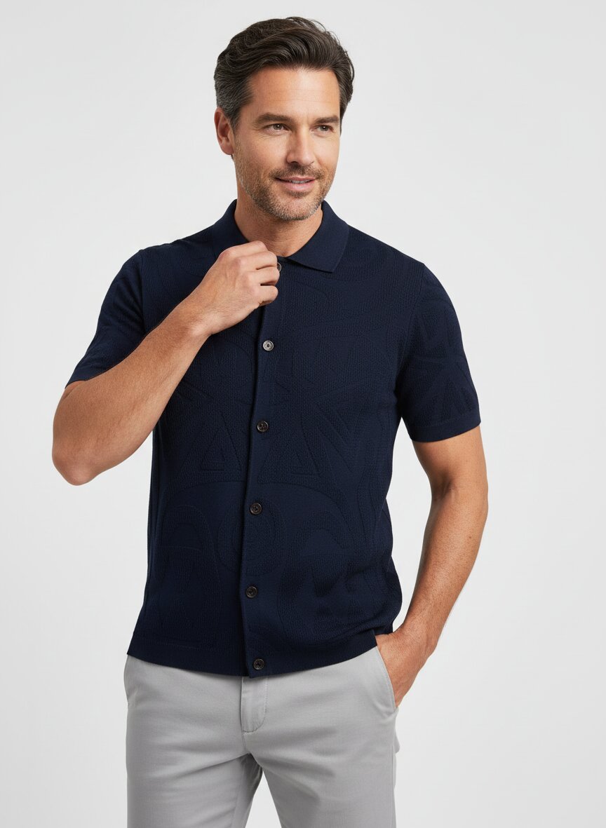 Knitshirt: Modernen Designerstil trifft auf markantes Jacquardmuster und Bowlingkragen