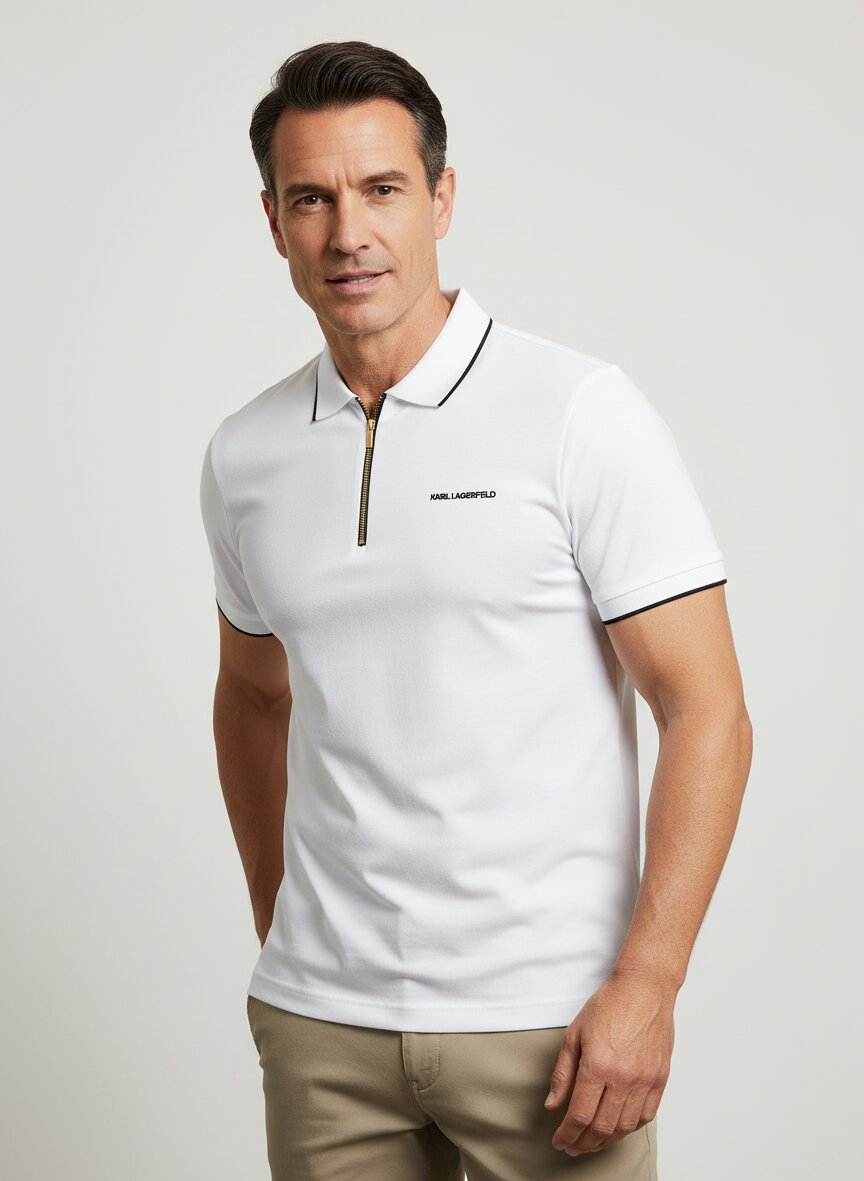 Das reine Baumwoll-Jersey schmiegt sich angenehm an den Körper und bietet maximale Atmungsaktivität – ideal für warme Tage ohne zu binden. Der durchgehende Reißverschluss ermöglicht flexible Layering-Optionen, während Kontraststreifen an Kragen und Ärmeln sowie die markante 3D-Logo-Applikation dem klassischen Schnitt moderne Präzision verleihen. Dieses Polo funktioniert sowohl im Business-Casual als auch in urbanen Freizeit-Looks gleichermaßen überzeugend. Die Rippentrickbündchen an Ärmeln und Saum sorgen für perfekte Passform und Langlebigkeit. KARL LAGERFELD verbindet hier Pariser Eleganz mit rockiger Funktionalität – monochrom, klar strukturiert und zeitlos tragbar.Unser Tipp: Kombinieren Sie das Polo mit einer Navy-Chino und weißen Sneakern für einen modernen Casual-Look, oder tragen Sie es unter einem Blazer für dezente Business-Eleganz.