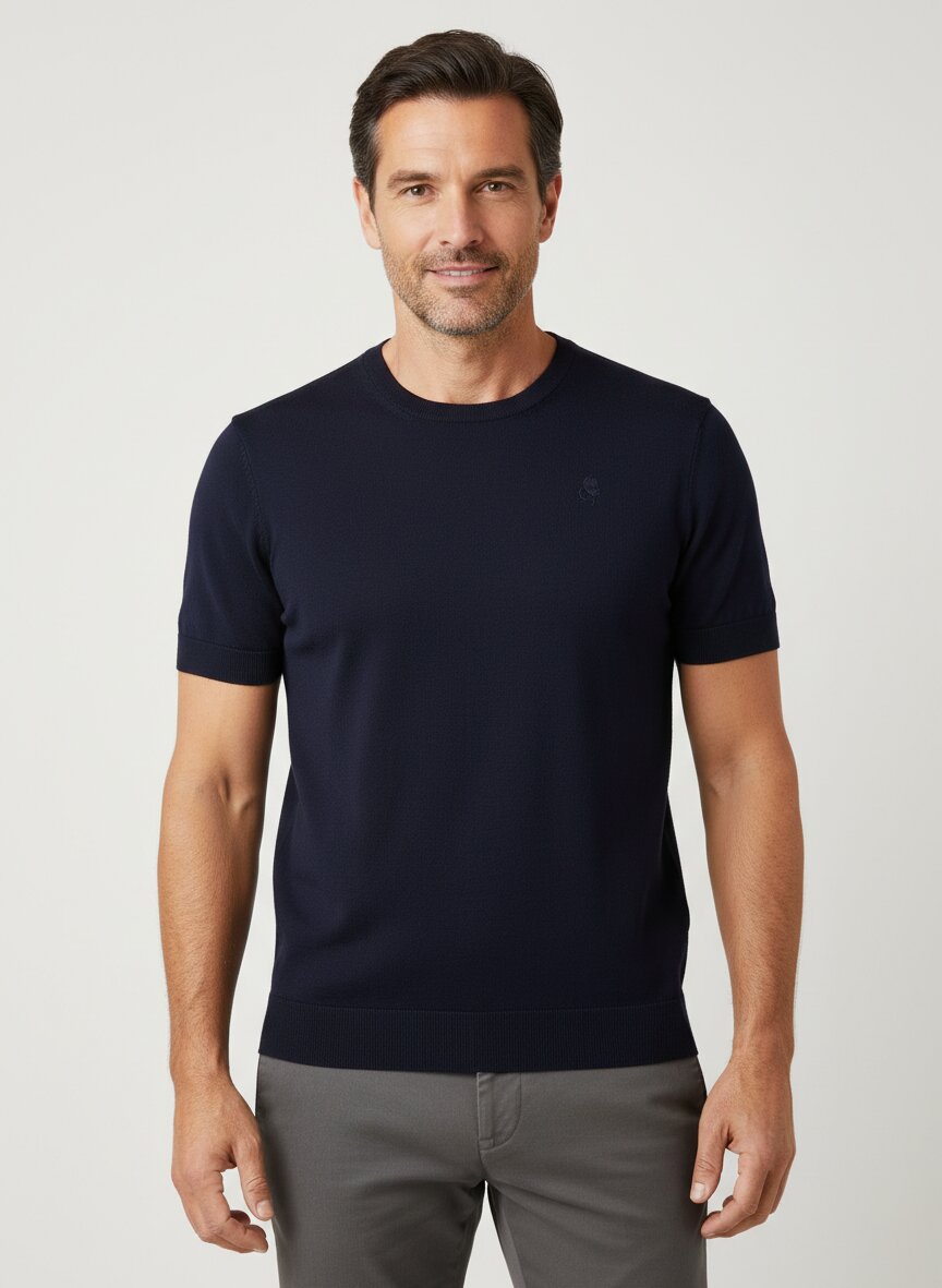 Dieses T-Shirt besticht durch seine reine Baumwollqualität und die subtile Struktur des Feinstricks, die dem klassischen Schnitt Tiefe verleiht. Das Material liegt weich auf der Haut und bietet optimale Atmungsaktivität für warme Tage – eine Investition in Langlebigkeit und Tragekomfort. Die schlichte Rundhals-Blende und der gerade geschnittene Körper machen es zum vielseitigen Basis-Piece für jeden Stil. In tiefem Dunkelblau wirkt das Shirt elegant und zeitlos, ohne dabei aufdringlich zu wirken. KARL LAGERFELD verbindet bei diesem Essential Pariser Minimalismus mit präziser Handwerkskunst – kein überflüssiges Detail, nur die Essenz.Unser Tipp: Kombinieren Sie das Shirt mit einer hellen Leinenhose und Ledersneakern für einen mühelosen Smart-Casual-Look, der von Frühjahr bis Sommer trägt.
