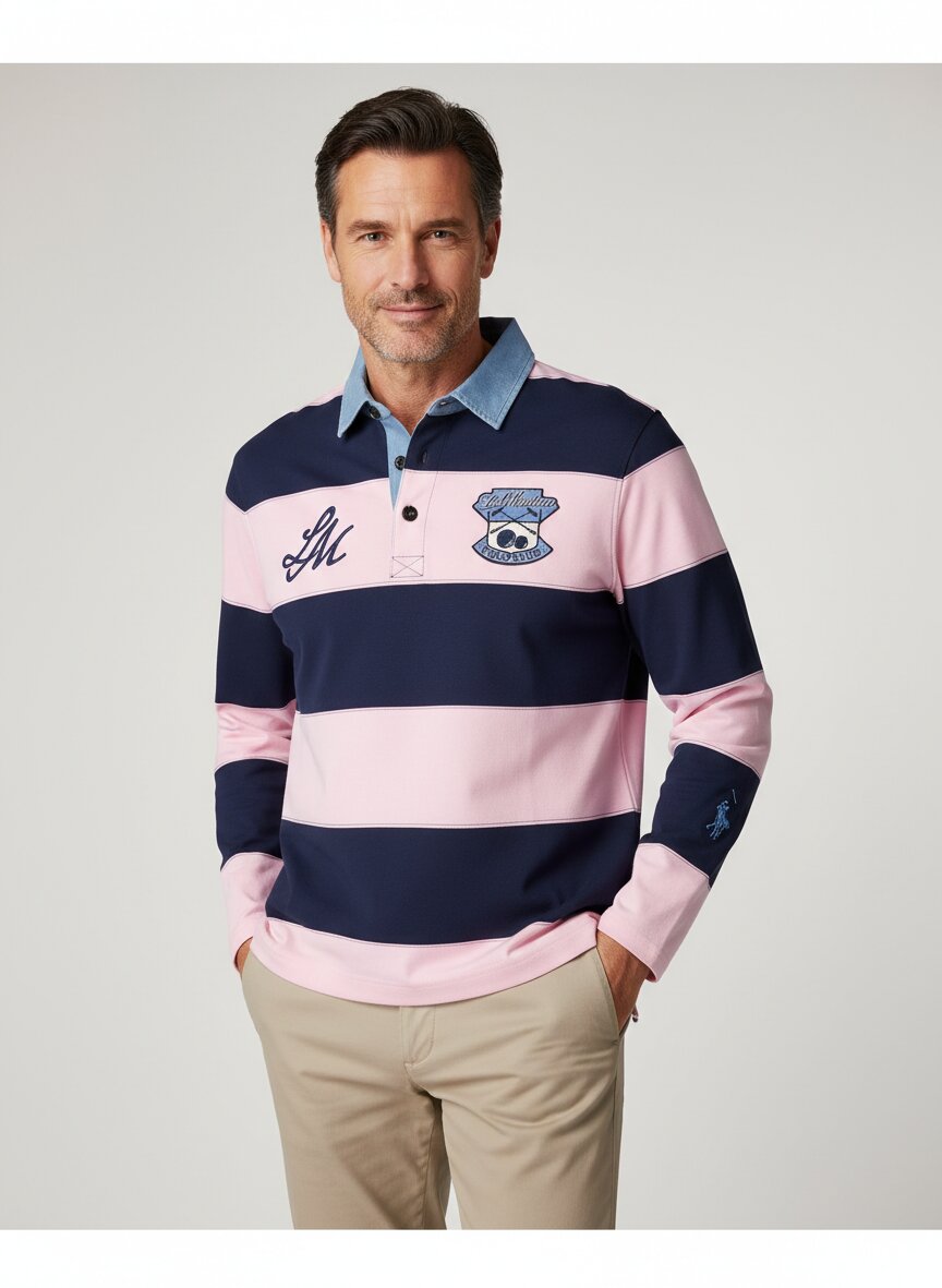Breite Streifen in zartem Rosa und tiefem Navy prägen dieses Rugby-Shirt und verleihen ihm sofort Charakter und sportliche Leichtigkeit. Die reine Baumwolle sitzt angenehm auf der Haut, atmet zuverlässig und behält auch nach häufigem Tragen ihre Form und Farbkraft. Der markante Kentkragen aus kontrastierendem Material sowie die durchgehende Knopfleiste unterstreichen den authentischen Rugby-Stil mit zeitloser Eleganz. Die Logo-Applikation an der Brust und die dezente Stickerei am Ärmel setzen subtile Akzente, während seitliche Schlitze für zusätzliche Bewegungsfreiheit sorgen. La Martina verbindet seit vier Jahrzehnten argentinischen Polo-Spirit mit europäischer Handwerkskunst – jedes Stück erzählt von dieser Leidenschaft für authentische Sportlichkeit. Für Frühjahr und Sommer ist dieses Shirt der ideale Begleiter, ob beim Casual-Lunch oder beim entspannten Wochenende.Unser Tipp: Kombinieren Sie das Rugbyshirt mit einer cremefarbenen Chino und weißen Sneakern für einen mühelosen, preppy-eleganten Look.