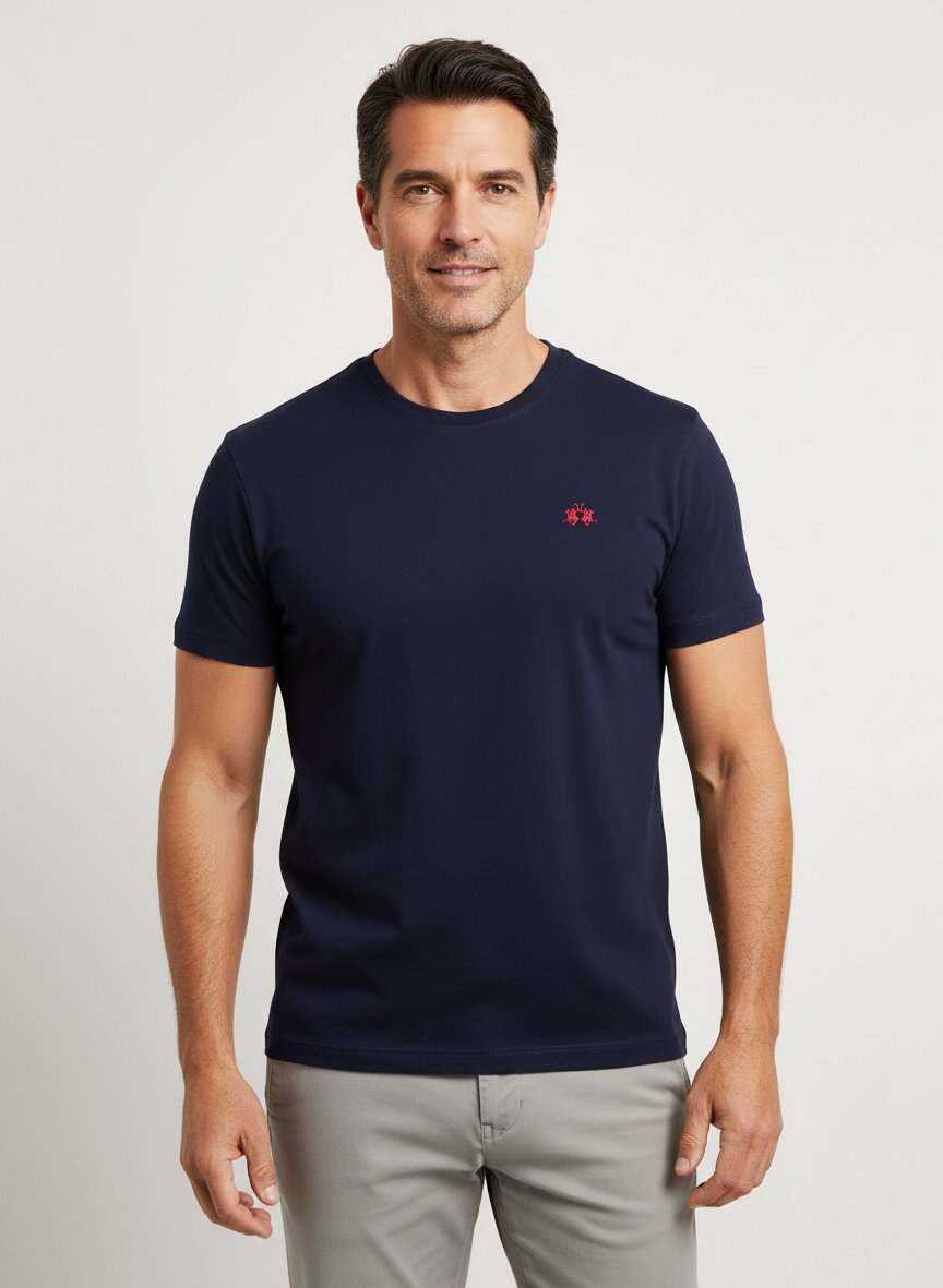 Dieses T-Shirt besticht durch sein tiefes Marineblau und die schlichte, zeitlose Formensprache – ein Grundstein für jeden modernen Herrengarderobe. Der Jersey aus 100 Prozent Baumwolle liegt weich auf der Haut und überzeugt mit natürlicher Atmungsaktivität, die den Körper auch an wärmeren Tagen angenehm reguliert. Der klassische Rundhals-Ausschnitt mit verstärkter innerer Einfassung garantiert Langlebigkeit und sitzt angenehm am Nacken. Die dezente Stickerei auf Brusthöhe links signalisiert Markenqualität, ohne dabei aufdringlich zu wirken. LA MARTINA verbindet seit 1985 argentinischen Polo-Spirit mit handwerklicher Präzision – jedes Stück erzählt von dieser Authentizität, ohne Kompromisse bei Material oder Verarbeitung.Unser Tipp: Kombinieren Sie das Shirt mit einer hellen Chino und Leinenschuhen für einen mühelosen Freizeit-Look, der von Frühjahr bis Sommer besticht.