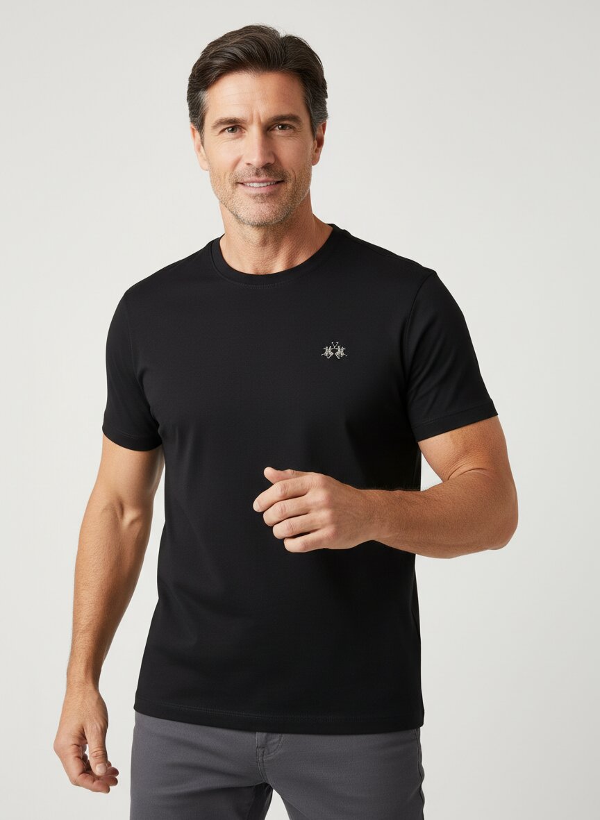 Dieses T-Shirt von LA MARTINA besticht durch sein zeitloses Schwarz und die schlichte Eleganz eines perfekt geschnittenen Rundhals-Ausschnitts. Die 100-prozentige Baumwolle in Jersey-Qualität liegt weich auf der Haut und bietet optimalen Tragekomfort an warmen Tagen. Der verstärkte Nackenbereich sorgt für Langlebigkeit und formbeständigen Sitz über viele Wäschen hinweg. Die dezente Stickerei auf Brusthöhe setzt ein subtiles Markenzeichen, ohne den minimalistischen Charakter zu stören. LA MARTINA verbindet seit Jahrzehnten argentinische Polo-Tradition mit zeitgenössischer Handwerkskunst – auch bei klassischen Basics bleibt diese Qualitätsphilosophie erkennbar.Unser Tipp: Kombinieren Sie das T-Shirt mit einer hellen Chino und Sneakern für einen mühelosen Sommer-Look, oder layern Sie es unter einer Leinenjacke für Business-Casual-Eleganz.