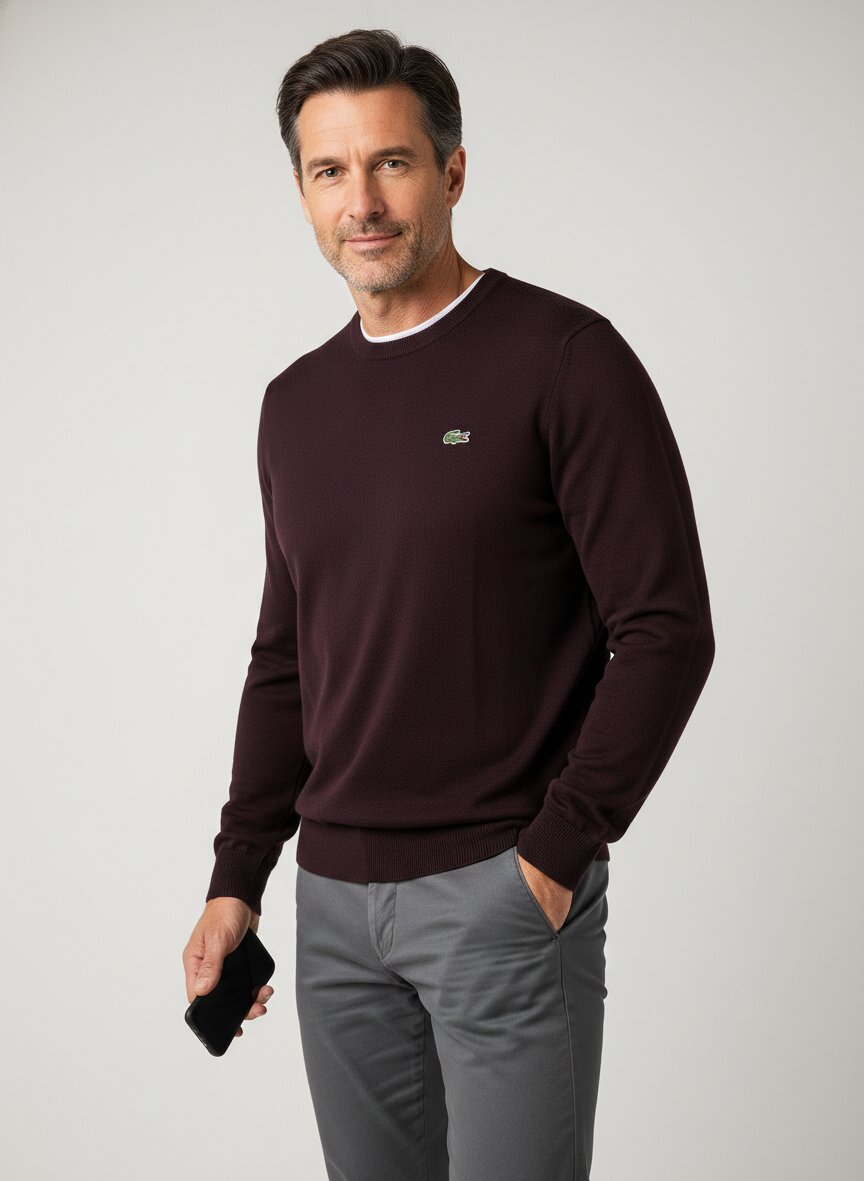 Dieser Rundhalspullover besticht durch seine puristische Eleganz und das charakteristische Lacoste-Understatement ohne aufwendige Details. Die Mischung aus 70 Prozent Bio-Baumwolle und 30 Prozent Polyamid schmiegt sich angenehm an den Körper und bietet gleichzeitig eine robuste Struktur, die auch nach häufigem Waschen ihre Form bewahrt. Der Regular Fit sitzt entspannt, ohne zu bauschen, und lässt sich mühelos über Hemden oder T-Shirts kombinieren. Das dunkle Braun wirkt geerdeter als klassisches Schwarz und passt zu einer breiten Farbpalette im Kleiderschrank. Seit 1933 verkörpert Lacoste die Philosophie des französischen Tennischampions René Lacoste: elegante Funktionalität statt Ornament, bewährte Qualität statt schnelllebige Trends.Unser Tipp: Tragen Sie den Pullover über einem weißen Oxfordhemd und kombinieren Sie ihn mit einer Beige-Chino für einen dezent eleganten Look, der vom Büro bis zum Wochenende funktioniert.