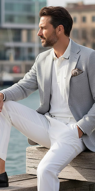 Ein Look für warme Tage mit Anspruch: Das leichte Leinensakko in Grün von Boss Black setzt einen frischen Akzent und wirkt durch seine Struktur besonders lebendig. Das cleane T-Shirt von Karl Lagerfeld hält das Styling bewusst reduziert, während die helle Hose von Windsor für eine luftige Silhouette sorgt. Loafer und Einstecktuch runden den Auftritt entspannt und dennoch präzise ab.