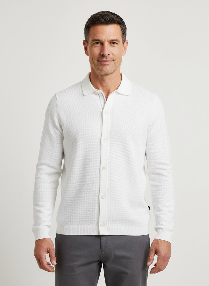 Ein fein strukturierter Strick in warmem Ecru verleiht diesem Cardigan von MAERZ München zeitlose Eleganz mit subtiler Oberflächentextur. Die reine Baumwolle schmiegt sich angenehm an die Haut und bietet dabei eine natürliche Atmungsaktivität, die besonders in wärmeren Monaten überzeugt. Der klassische Umlegekragen und die kontrastreich unterlegte Knopfleiste geben dem Strickjackenklassiker einen raffinierten Details-Charakter. Mit einer Rückenlänge von etwa 70 cm bei Größe 50 sitzt der Cardigan proportional perfekt über Hemden und leichten Shirts. MAERZ München steht seit Jahrzehnten für handwerklich präzise Strickwaren aus Deutschland – dezent, funktional und langlebig.Unser Tipp: Kombinieren Sie den Cardigan mit einer hellen Leinenhose und Loafern für einen eleganten Casual-Look, der mühelos vom Büro zum Wochenende passt.