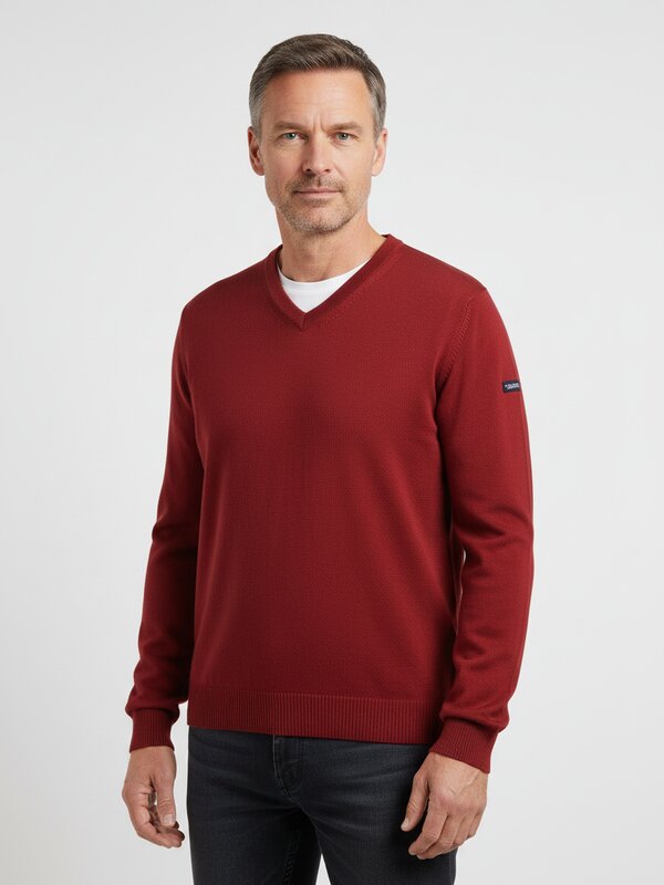Dunkelrot in reiner Merinowolle – der zeitlose V-Ausschnitt-Pullover