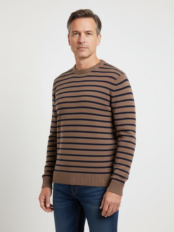 Die feinen Streifen in Braun und Navy verleihen diesem Pullover eine dezente Lebendigkeit, die klassische Eleganz mit sommerlicher Leichtigkeit verbindet. Das Bouclé-Gewebe aus Bio-Baumwolle fühlt sich griffig und temperaturausgleichend an – die strukturierte Oberfläche schmeichelt der Haut und vermeidet störendes Verkleben. Der Rundhalsauschnitt macht ihn zum vielseitigen Allrounder für Büro, Wochenende und entspannte Abende. Der hochwertige Material-Mix aus 93 Prozent Bio-Baumwolle mit Polyester und Polyamid sorgt für Langlebigkeit und Formbeständigkeit ohne Kompromisse. Marc O'Polo setzt seit Jahrzehnten auf natürliche Fasern und skandinavische Understatement-Ästhetik – dieser Pullover verkörpert beide Prinzipien ohne Umschweife.Unser Tipp: Kombinieren Sie den gestreiften Pullover mit einer hellen Chinohose und Loafern für einen mühelosen Smart-Casual-Look, der auch in den Übergangsjahreszeiten überzeugt.