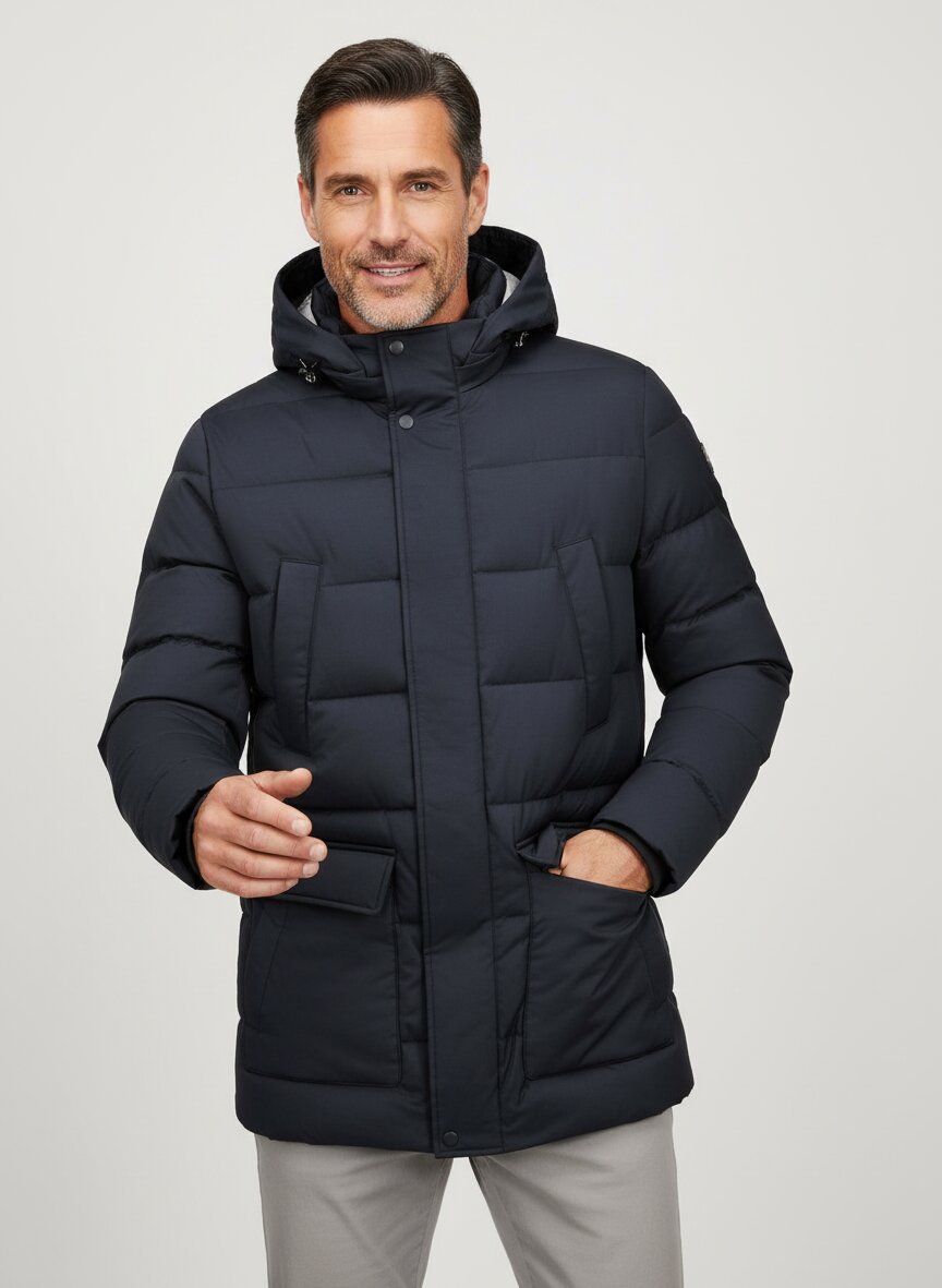 Eleganter Steppparka mit abnehmbarer Kapuze in elegantem Dunkelblau