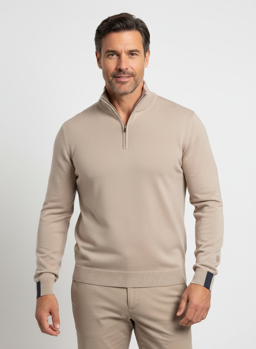 Der edle Mix aus 75 Prozent Wolle und 25 Prozent Seide schafft eine seidig-matte Oberfläche, die dem Feinstrick eine subtile Eleganz verleiht. Das Material liegt warm und geschmeidig auf der Haut, während die Seide für natürliche Atmungsaktivität sorgt und den Tragekomfort erheblich steigert. Der Troyer mit Stehkragen und verdecktem Reißverschluss eignet sich perfekt für den urbanen Alltag und lässige Business-Settings gleichermaßen. Kontraststreifen an den Ärmelbündchen setzen ein unerwartetes Detail, das erst beim zweiten Blick seine volle Wirkung entfaltet. Mos Mosh, 2010 am Küchentisch gegründet, verkörpert die dänische Philosophie der Liebe zum Detail – solide Verarbeitung trifft auf durchdachte Akzente, die den Unterschied ausmachen.Unser Tipp: Kombinieren Sie den Troyer mit einer strukturierten Chino in Beige und dunklen Lederschuhen für einen zeitlosen Look, der von Herbst bis Frühling funktioniert.