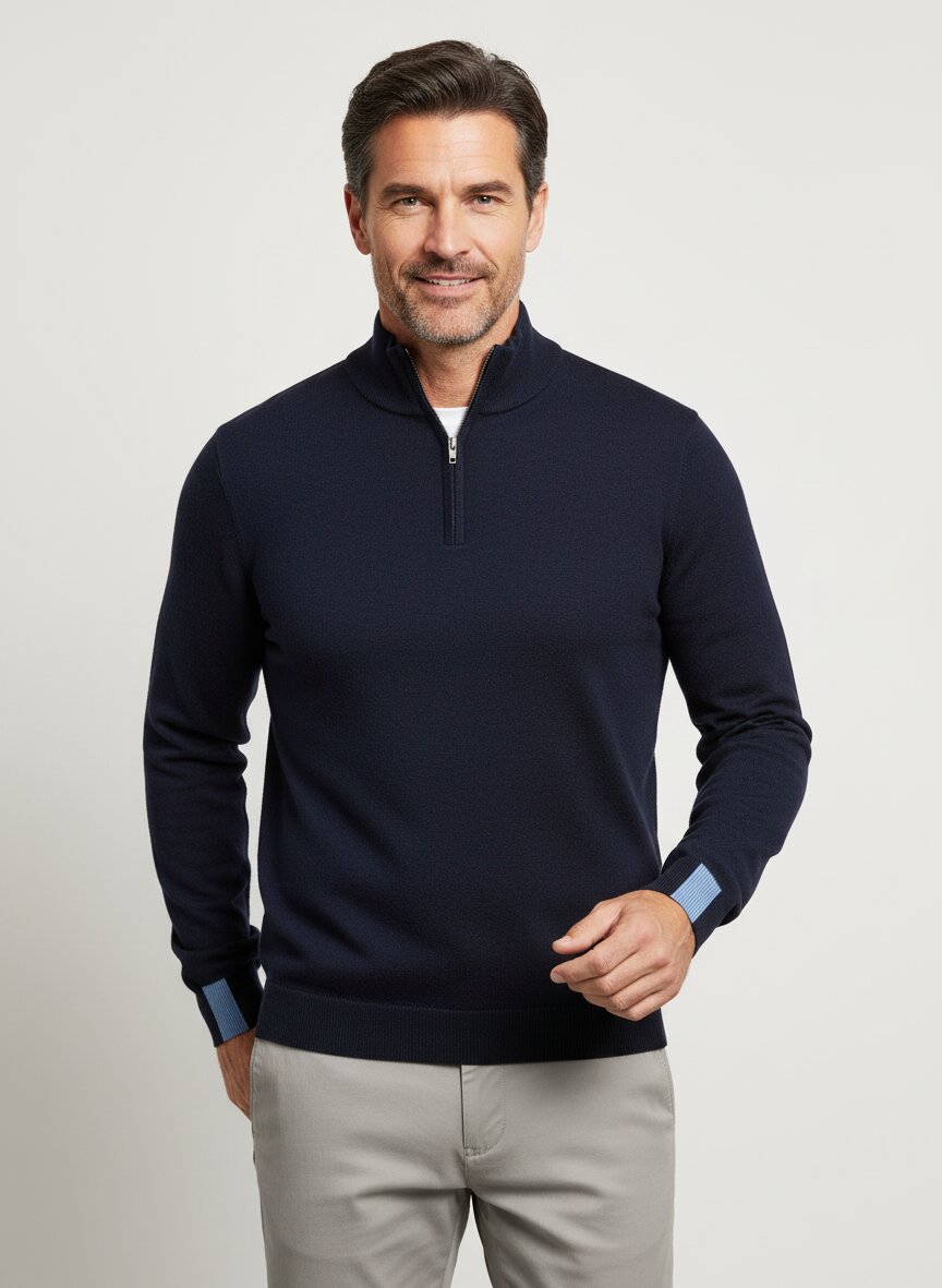 Der Troyer verfügt über einen Stehkragen und einen verdeckten Reißverschluss, die flexible Layering-Optionen ermöglichen – Sie können ihn geschlossen für formale Anlässe tragen oder offen über einem Hemd kombinieren. Ein charakteristisches Detail sind die feinen Kontraststreifen an den Ärmelbündchen.