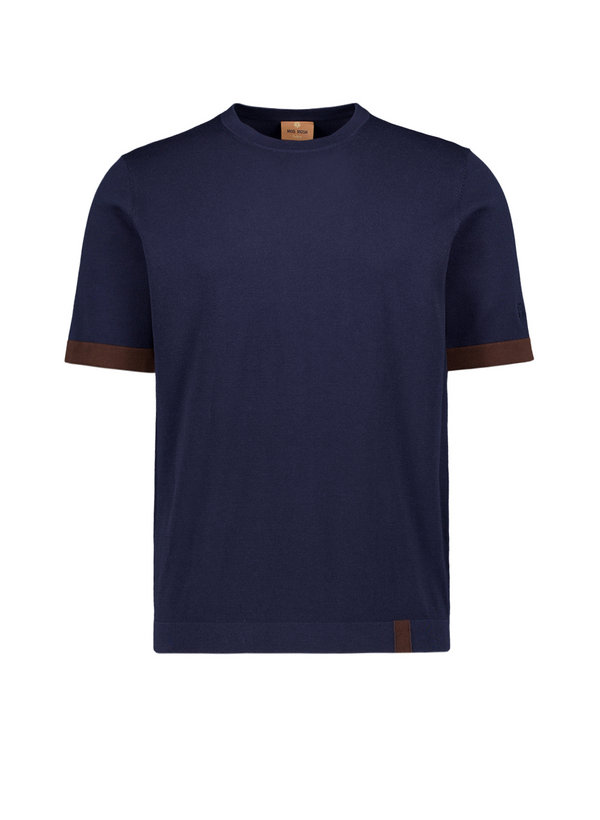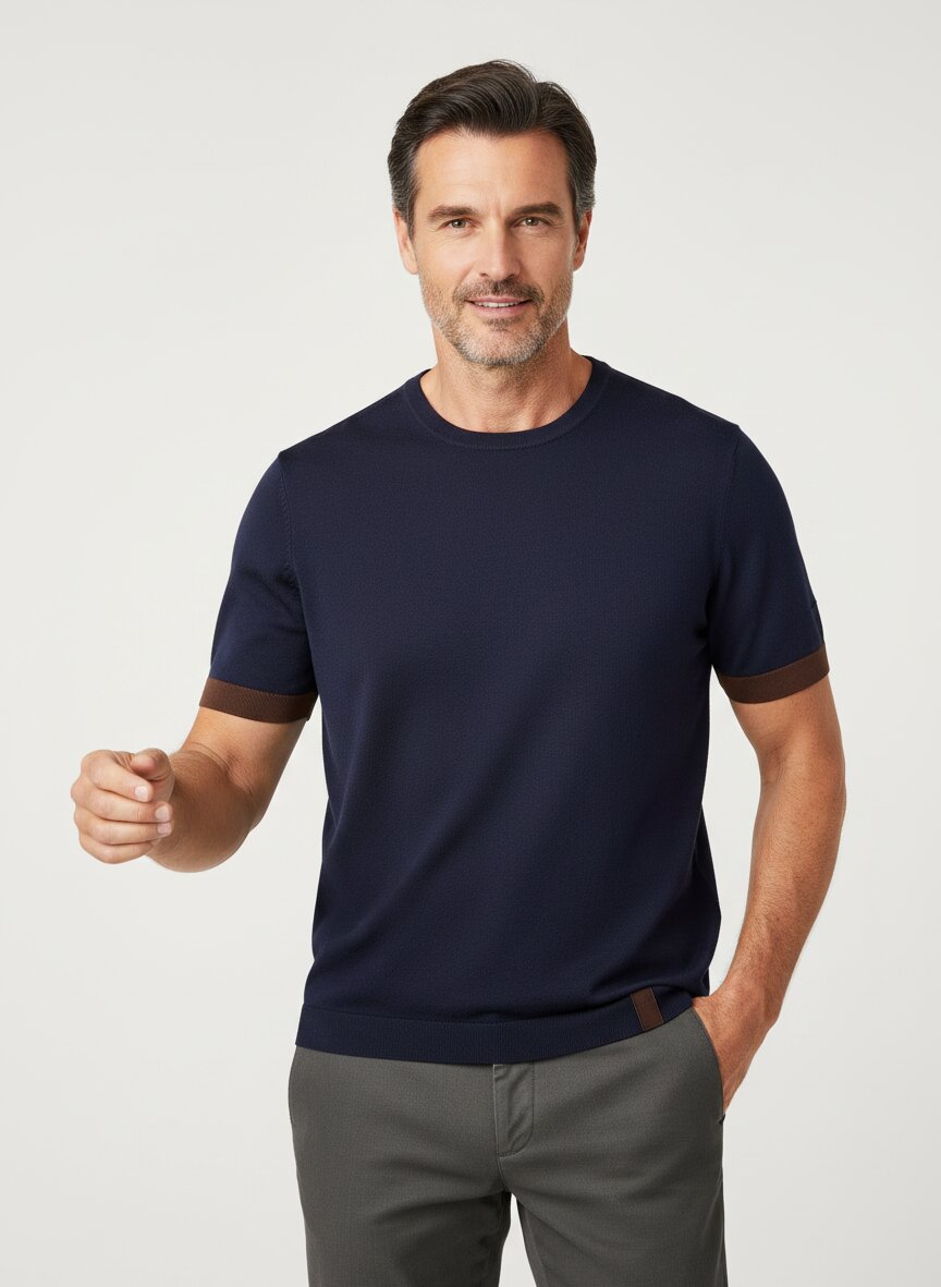 Das klassische dunkelblaue T-Shirt mit braunem Kontrast lässt sich vielseitig stylen – sowohl zu Jeans für einen casual Look als auch zu Chinos für ein eleganteres Outfit. Der Kontrast am Ärmel gibt dem Shirt einen subtilen, hochwertigen Touch.