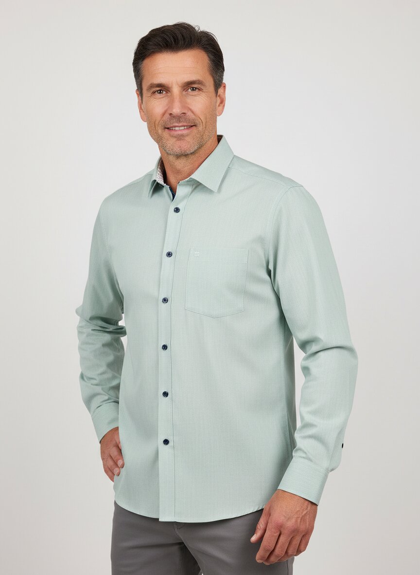 Ein feines grünes Streifenmuster auf reiner Baumwolle schafft Frische ohne Aufwand – das Luxor-Modell verzichtet auf lästiges Bügeln und behält dennoch seine klare Silhouette. Die atmungsaktive Baumwolle liegt angenehm auf der Haut und bietet den Tragekomfort, den man an warmen Tagen schätzt. Der großzügig geschnittene Comfort Fit wirkt dabei nie formlos und wird durch den klassischen Kentkragen mit Brusttasche zum verlässlichen Alltagsbegleiter. Kontrastmanschette und innerer Kragensteg verleihen dem Hemd subtile Eleganz und zeigen handwerkliche Sorgfalt in jedem Detail.