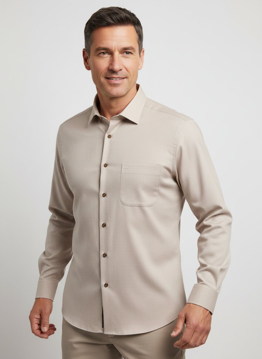 Das warme, melierte Nougat verleiht diesem Hemd eine natürliche Tiefenwirkung, die zwischen klassischem Beige und erdigen Brauntönen schwebt. Die reine Baumwolle fühlt sich griffig und atmungsaktiv an – ideal für wärmere Tage, ohne dabei an Struktur zu verlieren. Der Comfort Fit sitzt entspannt an Schultern und Taille und ermöglicht volle Bewegungsfreiheit im Alltag wie im Business. Die weitenverstellbare Kombimanschette und der dezente Kentkragen mit Brusttasche bieten klassische Eleganz ohne Umschweife. OLYMP steht seit 1951 für schwäbische Hemdenkunst – Bügelfreiheit, die nicht auf Qualität verzichtet, sondern diese sogar verstärkt.Unser Tipp: Kombinieren Sie das Hemd mit einer grauen Wollhose und Loafern für einen mühelosen Business-Casual-Look, der auch nach einem langen Arbeitstag noch präsentabel wirkt.
