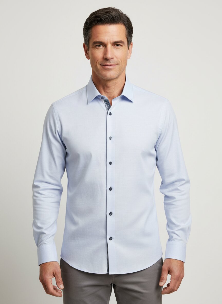 Das Hemd ist mit einem klassischen Kent-Kragen ausgestattet, der zeitlos elegant wirkt und sich ideal für Business- und Freizeitlooks eignet.
