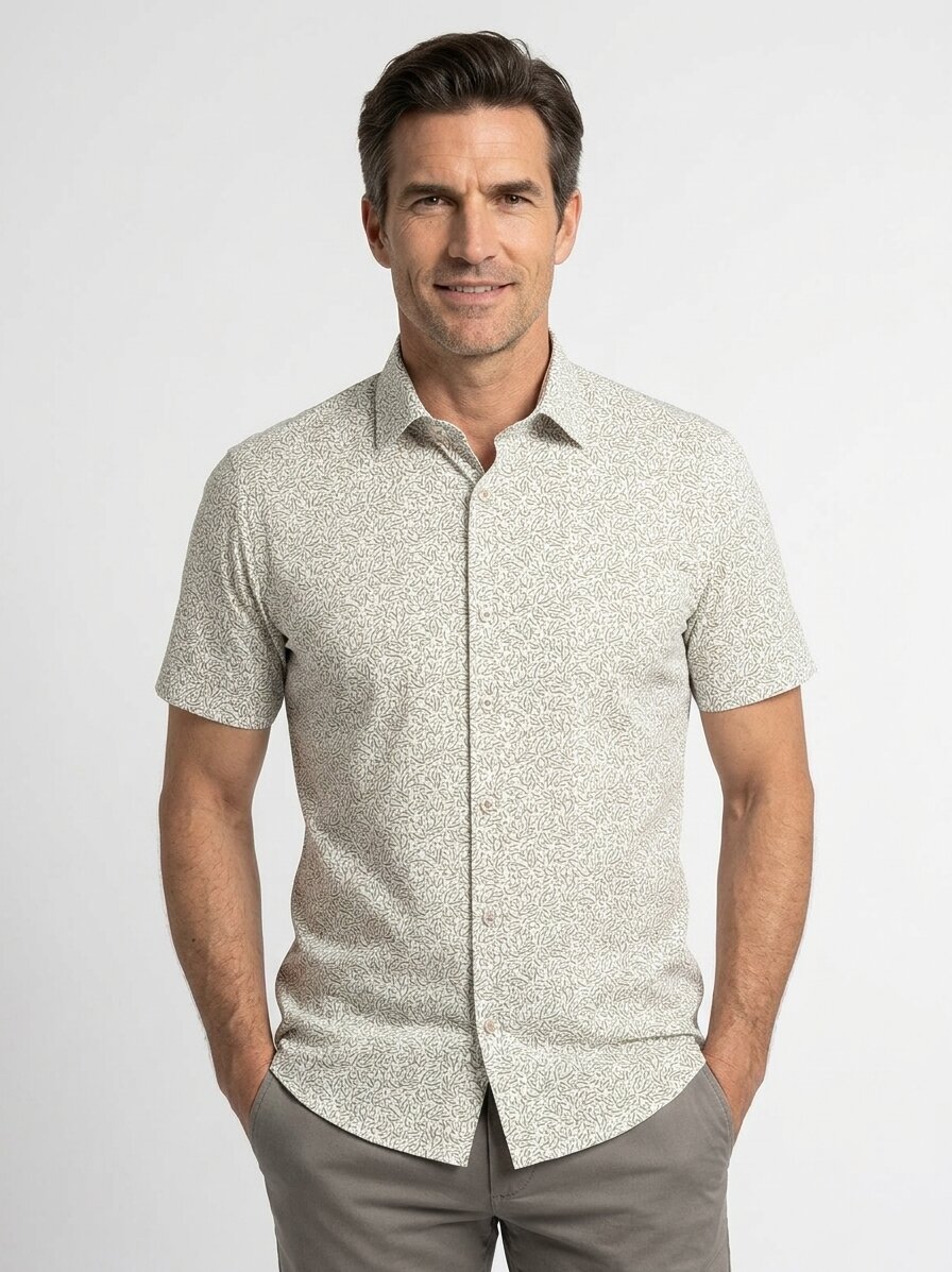 Das olivgrün gemusterte Hemd mit weißem Untergrund ist perfekt für Casual-Looks geeignet. Es lässt sich hervorragend zu Chinos, Jeans oder leichten Sommerhosen kombinieren und eignet sich auch für Business-Casual Outfits.