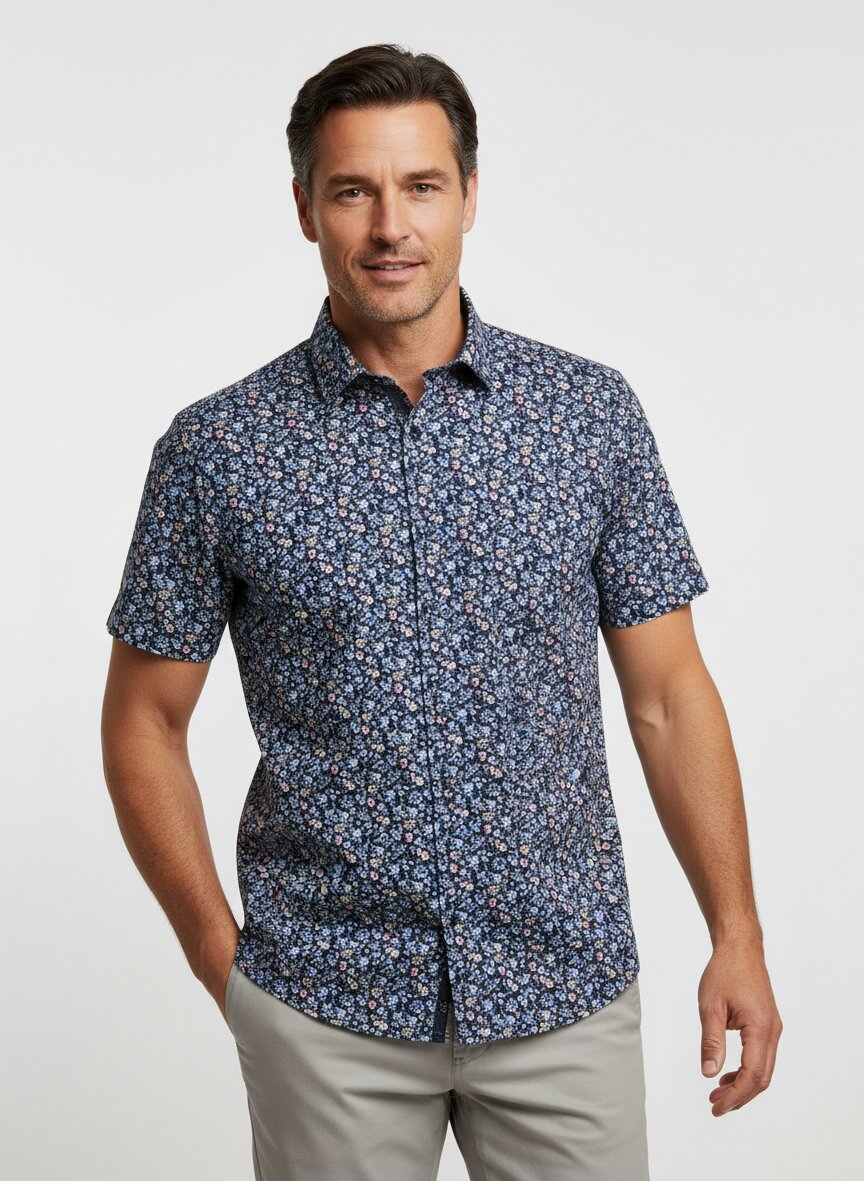 Das marine Hemd mit feinem floralem Muster ist vielseitig einsetzbar – von legeren Sommeroutfits über Freizeit bis hin zu Business-Casual Kombinationen. Es bringt Farbe und Charakter in den Alltag.