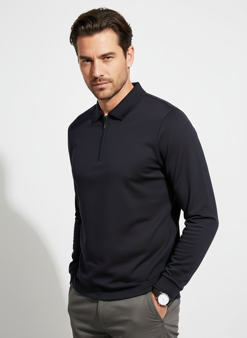Schwarzes Langarm-Polo mit Reißverschluss-Detail