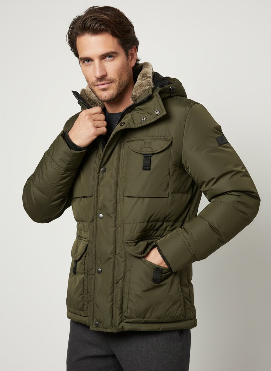 Olivgrüne Daunenjacke mit abnehmbarem Pelzkragen