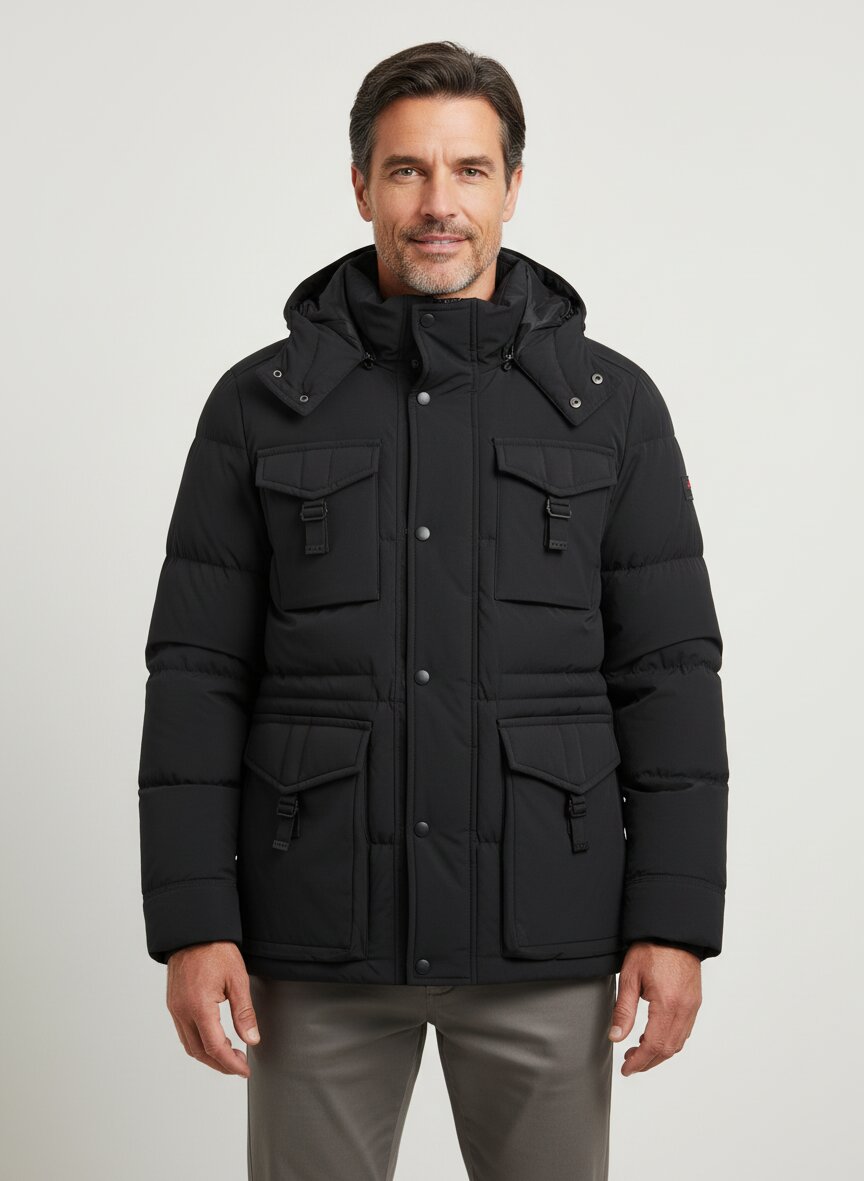 Die matte Mikrofaser in tiefem Schwarz verleiht dieser Daunenjacke urbane Eleganz mit technischem Anspruch. Das atmungsaktive Material aus Polyamid und Elasthan bietet Bewegungsfreiheit, während die hochwertige 80/20 Daunenfüllung zuverlässig vor Kälte schützt. Für den Alltag in der Stadt oder spontane Ausflüge ins Umland kombiniert sie Funktionalität mit stilsicherem Auftreten. Der Zwei-Wege-Reißverschluss mit darüberliegender Druckknopfblende, die angeschnittene Kapuze und die durchdachten 2-in-1 Taschen zeigen die Liebe zum Detail. PEUTEREY verbindet seit 2002 toskanische Textiltradition mit alpiner Inspiration vom Mont Blanc – hochwertige Verarbeitung für Männer, die italienische Qualität und durchdachte Details schätzen. Diese Jacke begleitet Sie zuverlässig durch die kalten Monate und bietet dank regulierbarer Taille optimalen Tragekomfort.Unser Tipp: Kombinieren Sie die Jacke mit einer grauen Wollhose und Chelsea Boots für einen eleganten Winter-Look.