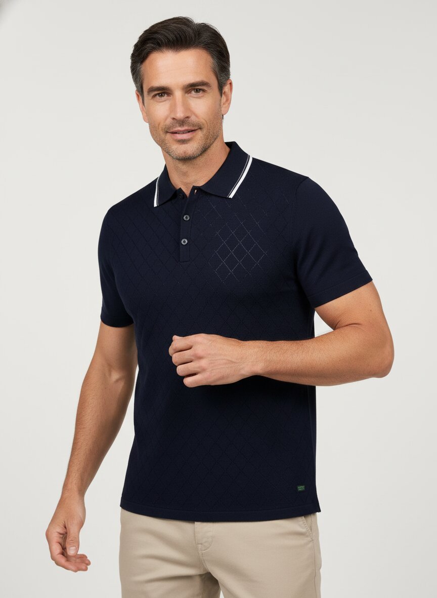 Das Strickpolo von Pierre Cardin ist aus einem feinen Netzstoff gefertigt, der eine strukturierte Oberfläche mit geometrischem Muster bietet. Diese Konstruktion sorgt für gute Atmungsaktivität und macht das Shirt ideal für wärmere Jahreszeiten.