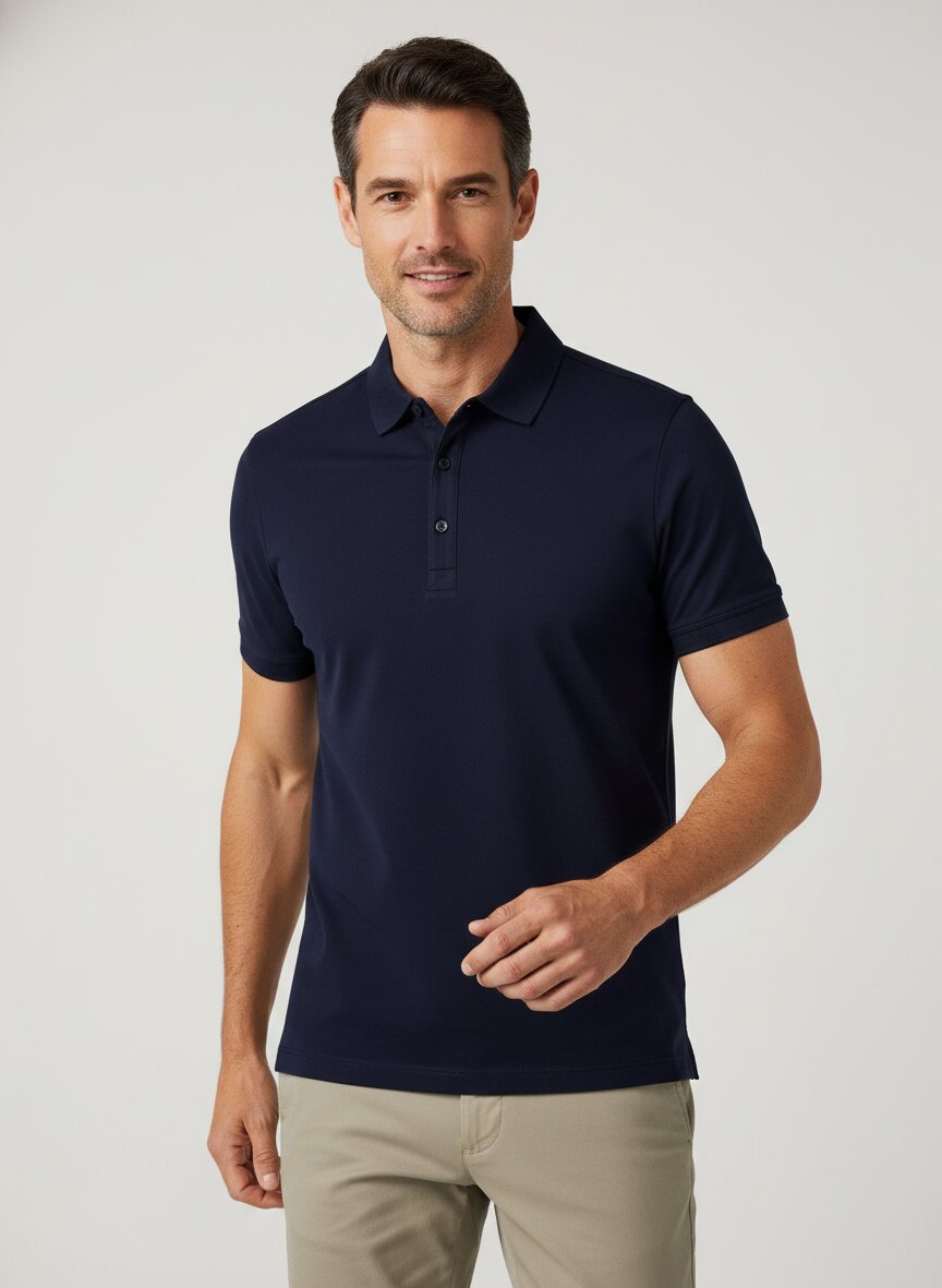 Das Shirt verfügt über einen klassischen Polokragen mit Knopfleiste zum Verschließen, was es besonders vielseitig und elegant macht.