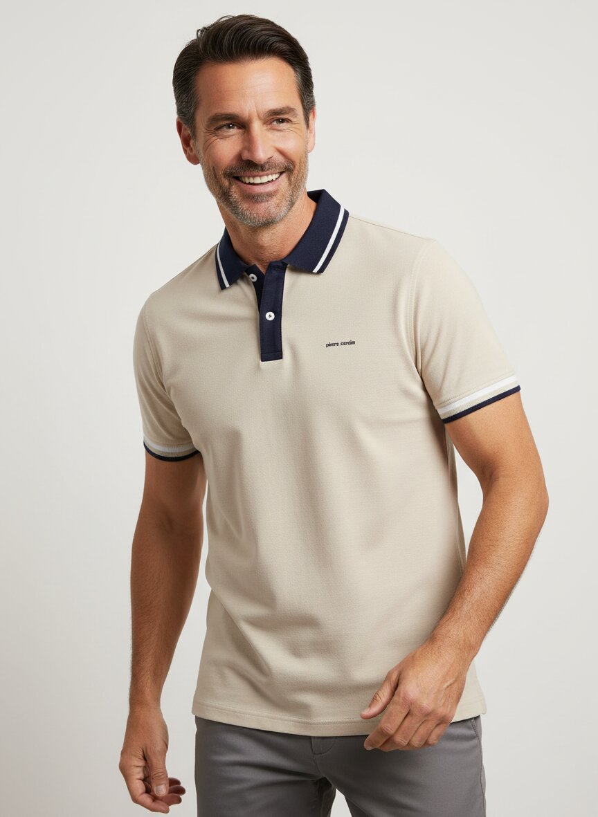 Das klassische beige Polo-Shirt mit dunklem Kragen eignet sich perfekt für legere Freizeitlooks, Geschäftscasual oder entspannte Wochenendoutfits. Die zeitlose Farbkombination lässt sich vielseitig kombinieren.