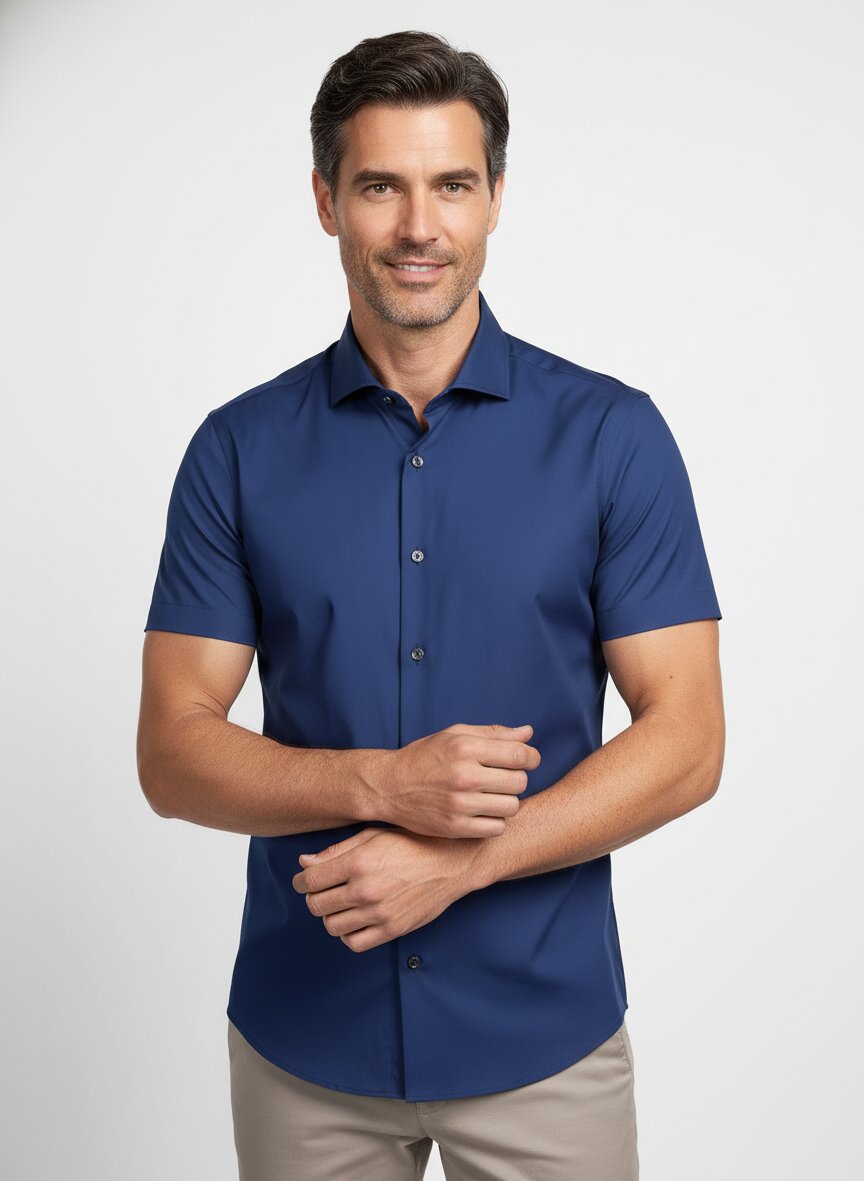 Das dunkelblau Hemd ist ein vielseitiges Klassiker-Piece. Es lässt sich hervorragend mit Chinos, Jeans oder Business-Hosen kombinieren und passt zu verschiedensten Anlässen – vom Büro bis zum Wochenende.