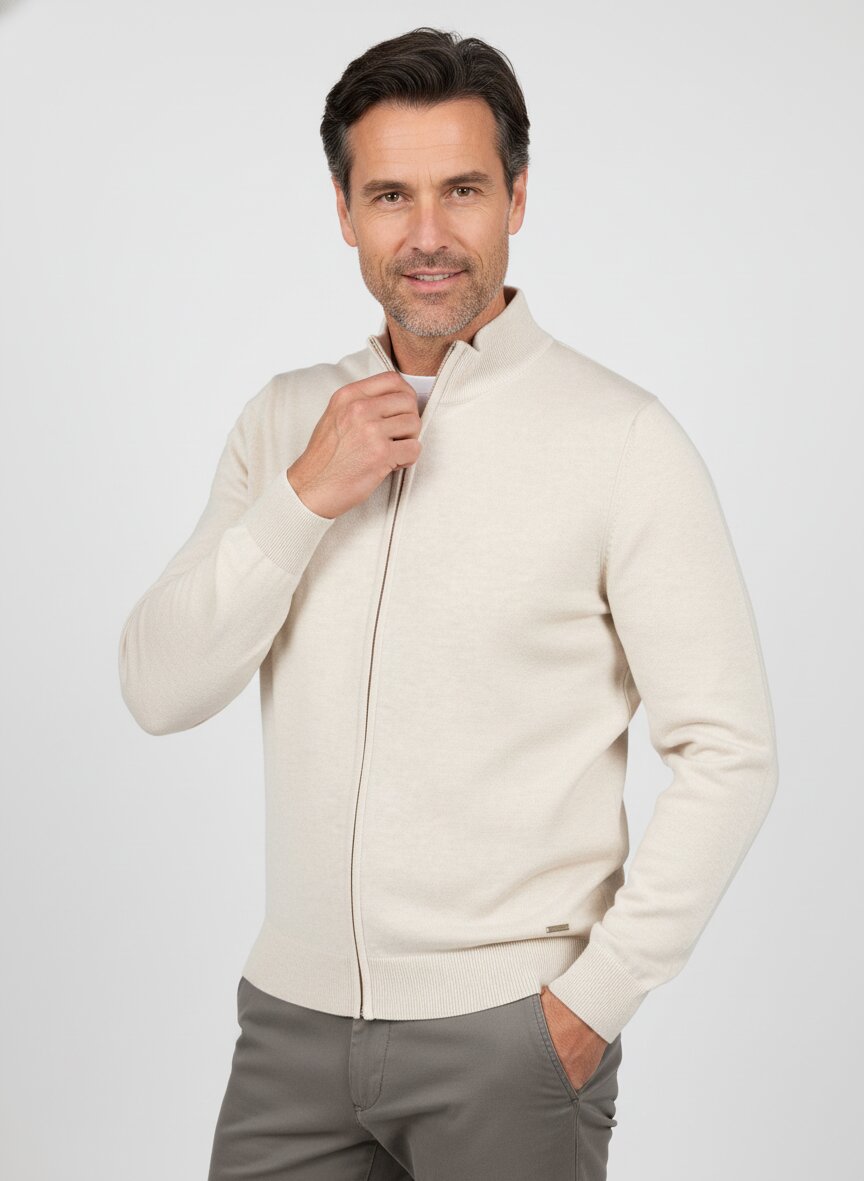 Der Cardigan verfügt über einen charakteristischen Stehkragen und einen durchgehenden Reißverschluss für einfaches An- und Ausziehen.