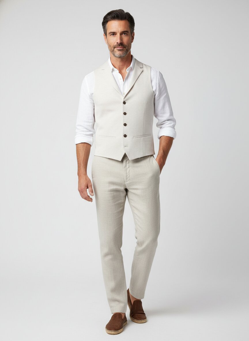 Diese Weste besticht durch ihre feine hellbraun melierte Färbung und den geschmeidigen italienischen Jersey – eine Materialkombination aus 73% Viskose, 25% Polyamid und 2% Elasthan, die Eleganz mit Bewegungsfreiheit verbindet. Der weiche Griff liegt angenehm auf der Haut und behält seine Form durch den hohen Viskoseanteil, während das Elasthan Flexibilität im Alltag garantiert. Mit klassischem Reverskragen und seitlichen Leistentaschen funktioniert die Weste sowohl über einem Hemd im Business-Kontext als auch layered zu Pullover und Jacke im Smart-Casual-Bereich. Der weitenregulierbare Rückenriegel ermöglicht eine individuelle Passform – ein durchdachtes Detail für verschiedene Körpertypen. Roy Robson verkörpert seit 1922 deutsche Schneiderkunst auf höchstem Niveau: Über 200 Arbeitsschritte pro Sakko, italienische Materialien und zeitlose Schnitte prägen das Familienunternehmen. Für Frühjahr und Sommer bietet diese Jersey-Weste die perfekte Ergänzung zu klassischen Anzügen oder als eigenständiges Layering-Piece bei Wetterwechsel.Unser Tipp: Kombinieren Sie die melierte Weste mit einem cremefarbenen Leinen-Hemd und einer Navy-Hose für einen raffinierten Business-Look mit mediterranem Touch.