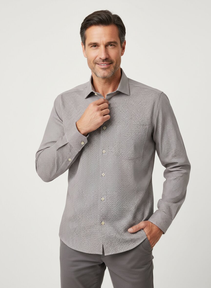 Das Hemd hat ein subtiles All-Over Muster in Brauntönen, das dem Hemd dezente Struktur und zeitlose Eleganz verleiht – perfekt für jeden Anlass.