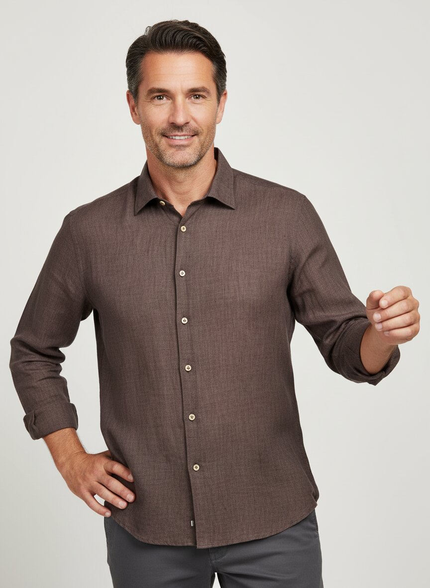 Das Hemd ist in einem dunkelbraun melierten Farbton erhältlich. Diese Farbe ist vielseitig kombinierbar und wirkt zeitlos elegant.