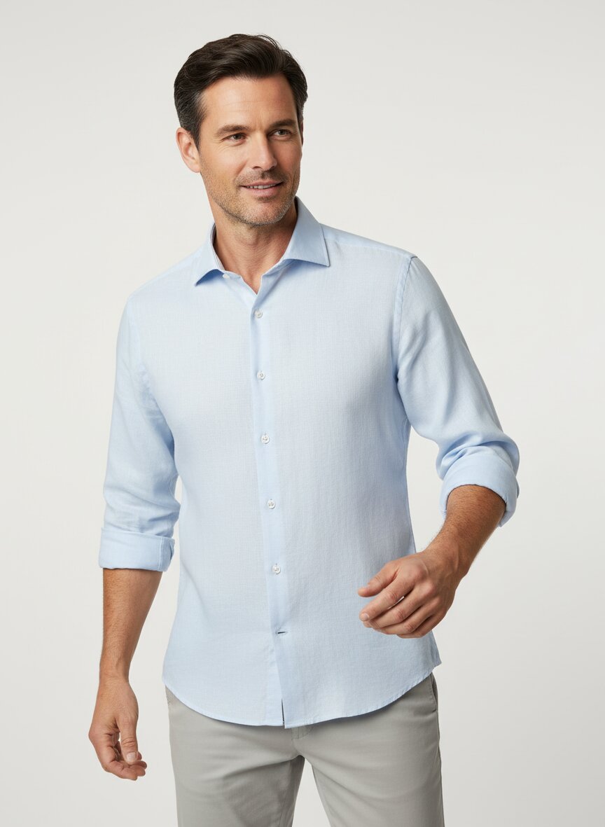 Das klassische hellblaue Hemd lässt sich vielseitig stylen: zu Chinos oder Jeans für den Alltag, oder mit einer Anzughose und Sakko für geschäftliche Anlässe. Die schlichte Farbe macht es zu einem zeitlosen Basis-Piece in jeder Garderobe.