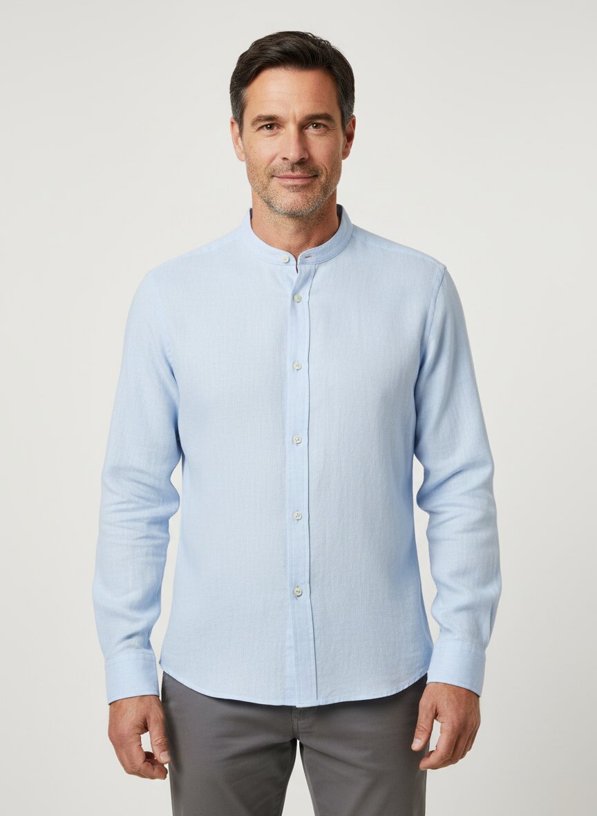 Das Hemd verfügt über einen klassischen Stehkragen, der ihm ein modernes und elegantes Aussehen verleiht. Der Stehkragen eignet sich besonders gut für stilvolle Kombinationen mit oder ohne Krawatte.