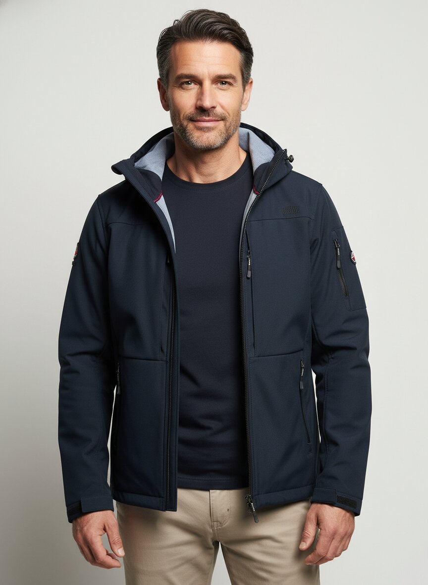 Die Jacke verfügt über eine verstellbare Kapuze, durchdachte Taschen und einen durchgehenden Reißverschluss für einfaches An- und Ausziehen. Das Design kombiniert Funktionalität mit modernem Stil.