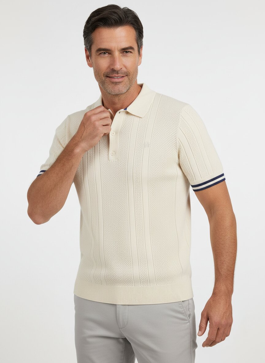 Das Polo verfügt über eine strukturierte Strickoberfläche mit vertikalen Mustern und kontrastierenden Ärmelbündchen in Marineblau, die dem Design einen klassischen Look verleihen.