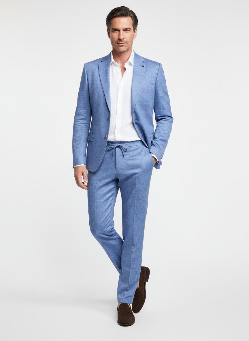 Das charakteristische Blau meliert wirkt lebendig und gewebt zugleich – eine Farbe, die zwischen klassischem Anzug und moderner Sportlichkeit schwebt. Der hochelastische Jersey aus 62 % Polyester, 15 % Lyocell und 13 % Baumwolle folgt jeder Bewegung, ohne die formale Silhouette zu verraten; 85 % des Stoffes stammen aus recyceltem Material und schonen damit Ressourcen ohne Kompromisse. Im Slim Fit sitzt der Einreiher mit Doppelschlitz und paspellierten Pattentaschen präzise, während die Hose mit elastischem Seitenbund und Bügelfalte sowohl im Büro als auch beim Spaziergang trägt. Das Taschenfutter des Sakkos lässt sich als Einstecktuch herausziehen – ein subtiles Detail, das Eleganz mit Spielraum verbindet. Seit 2002 spezialisiert sich ZUITABLE aus Düsseldorf auf Jersey-Anzüge, die den starren Schnitt klassischer Anzüge mit der Elastizität moderner Stoffe vereinen; das Baukastenprinzip ermöglicht es, Sakko und Hose einzeln zu kombinieren. Im Frühling und Sommer bietet der halbgefütterte Jersey optimale Bewegungsfreiheit ohne Schweißstau – ideal für Männer, die zwischen Business und Alltag fließend wechseln.Unser Tipp: Tragen Sie den Anzug mit einem weißen Leinenhemd und dezenten Loafern für einen urbanen Business-Look, oder kombinieren Sie das Sakko einzeln mit dunkler Jeans und Sneakern für entspannte Wochenenden.