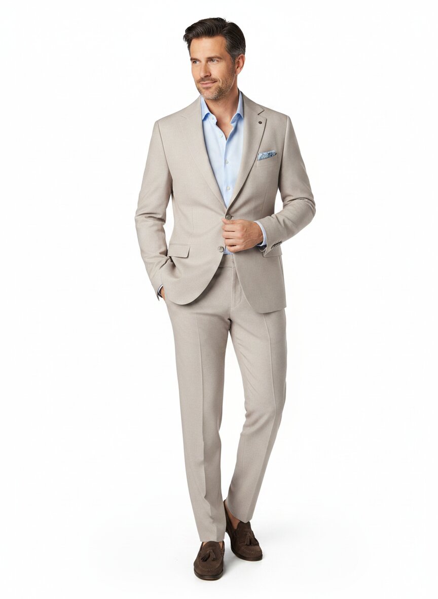 Ein beige meliertes Dessin verleiht diesem zweiteiligen Anzug subtile Struktur und zeitgemäße Leichtigkeit. Das Jersey-Gewebe aus 80 % Polyester, 12 % Viskose und 8 % Elasthan schmiegt sich an den Körper an und folgt jeder Bewegung – ohne die klassische Anzug-Silhouette zu verlieren. Sakko und Hose funktionieren als eigenständige Bausteine: Das Sakko mit Brusttasche und herausziehbarem Taschenfutter-Detail sowie seitlich paspelierten Pattentaschen wirkt genauso souverän zum Business-Termin wie zur urbanen Freizeit-Kombination. Die Hose besticht durch ihren elastischen Seitenbund, Bügelfalte und den flexiblen Tunnelzug – Komfort ohne Kompromisse. ZUITABLE aus Düsseldorf hat sich seit 2002 auf diese Synthese spezialisiert: klassische Schnitte in elastischen Stoffen, die Bewegungsfreiheit mit gepflegter Optik verbinden – ideal für Männer, die nicht zwischen Stil und Alltagstauglichkeit wählen möchten.Unser Tipp: Kombinieren Sie den Anzug mit einer weißen Leinenhemd und Sneakern für einen modernen Smart-Casual-Look, oder ergänzen Sie ihn mit der passenden Weste (Produktnummer 460457) für den klassischen Dreiteiler.